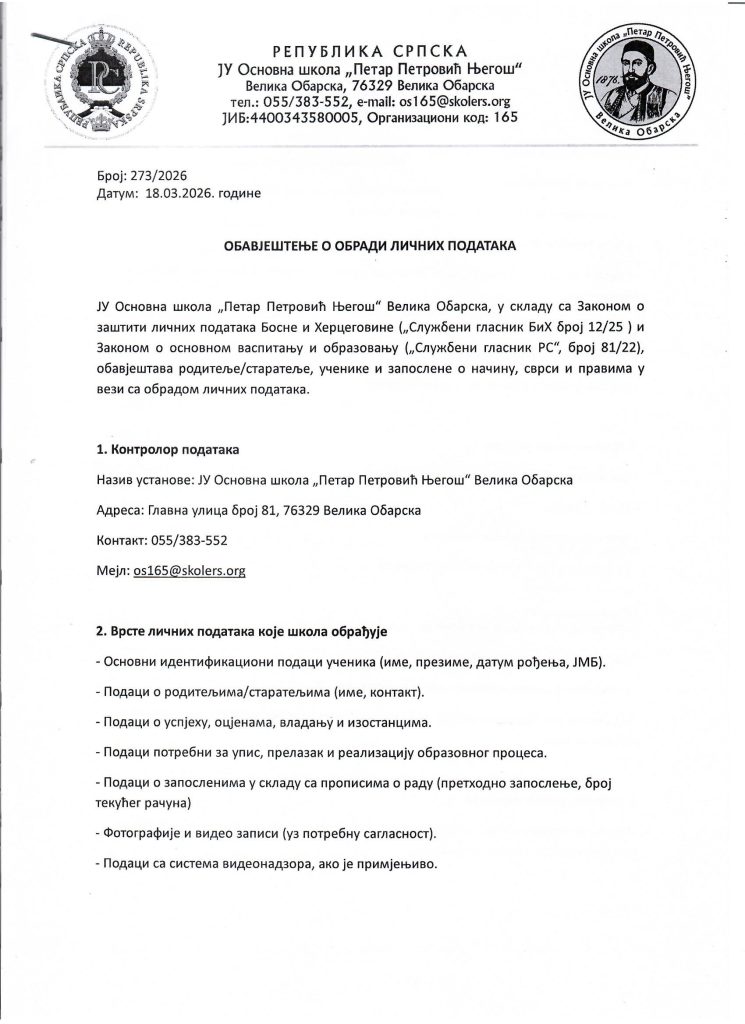 - Упутство о начину, поступку и смјерницама заштите и безбједности дјеце током боравка у школи број 72/26 од 20.01.2026. године.