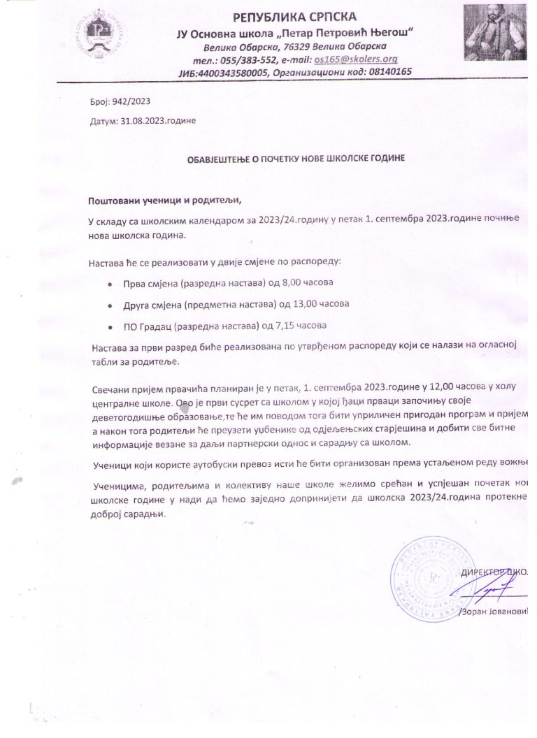 ОбавјештењаОБАВЈЕШТЕЊЕ О ПОЧЕТКУ НОВЕ ШКОЛСКЕ ГОДИНЕОБАВЈЕШТЕЊЕ О ПОЧЕТКУ НОВЕ ШКОЛСКЕ ГОДИНЕ admin31/08/2023