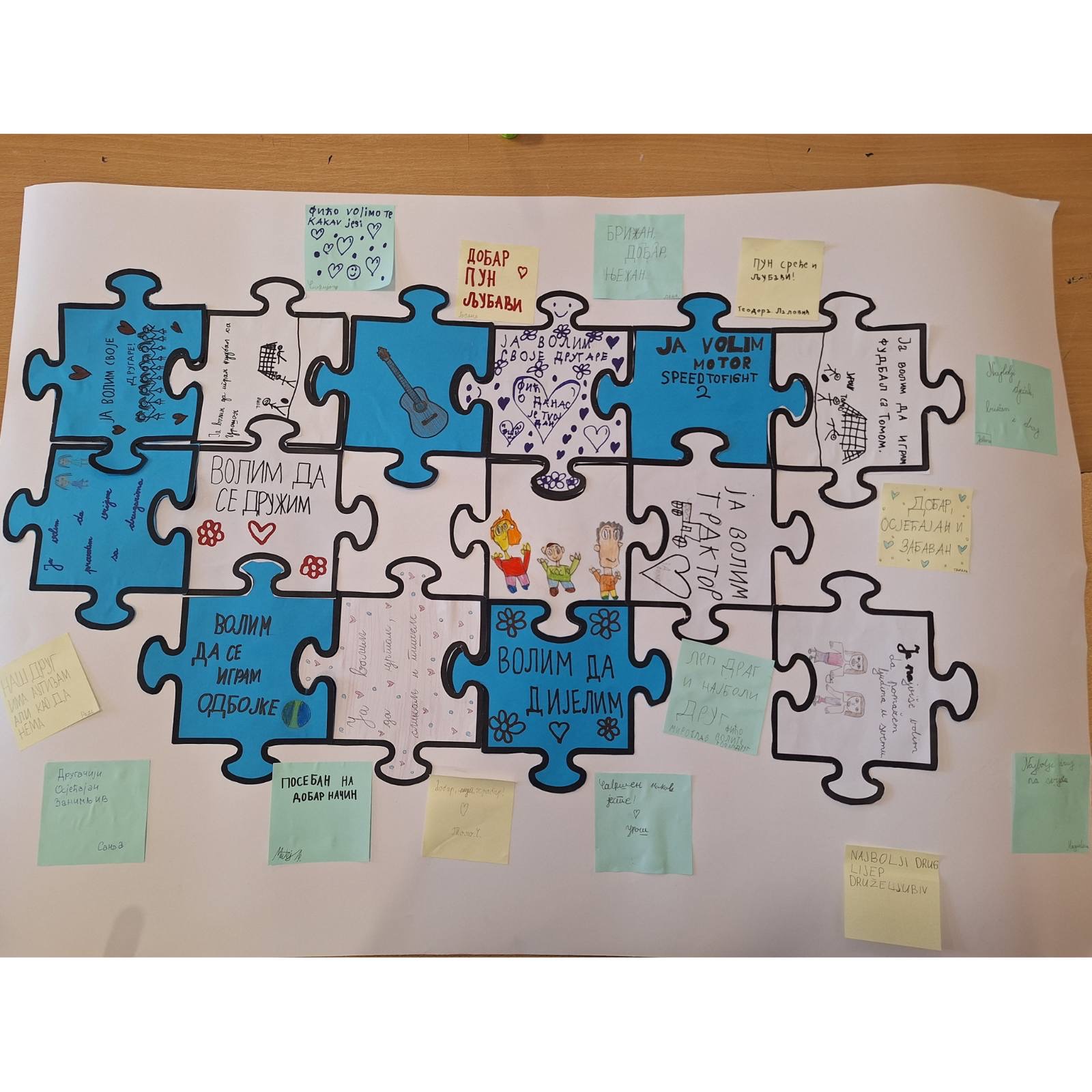 У наставку активности, сваки ученик је добио по једну пузлу, укључујући и ученика са аутизмом, са задатком да нацрта или напише нешто што воли. На тај начин истакнута је јединственост сваког дјетета и важност уважавања индивидуалних интересовања. Посебно дирљив тренутак био је када су ученици описивали свог друга у три ријечи, наглашавајући његове позитивне особине и вриједности које препознају код њега.