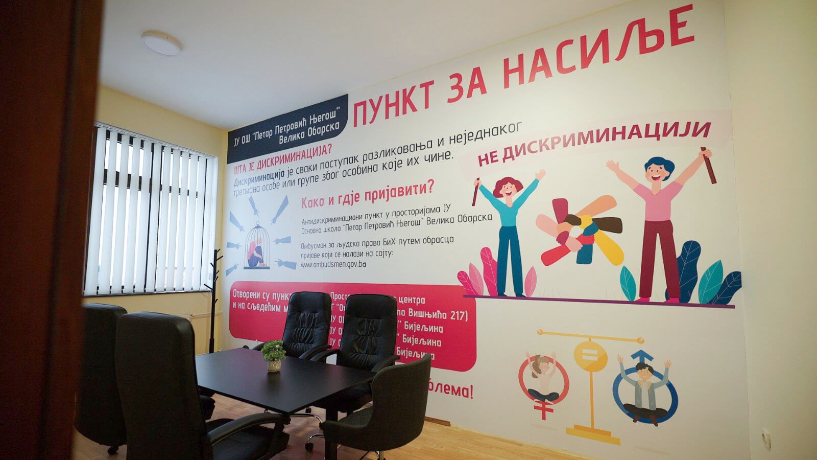 У оквиру иницијативе за стварање што безбједнијег окружења за све ученике, у нашој школи је у оквиру пројекта „Не дискриминацији” који спроводи УГ Отахарин, отворен АНТИДИСКРИМИНАЦИОНИ ПУНКТ за борбу против насиља и дискриминације. Овај пројекaт је финансиран из ЕУ фондова. Просторија пункта је осмишљена као сигурно мјесто у коме ученици могу разговарати о важним темама, подијелити своја искуства и добити помоћ уколико се суочавају са било којим обликом насиља или дискриминације.