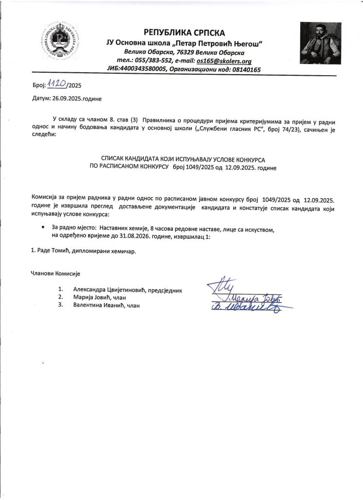 Списак кандидата који испуњавају услове конкурса хемија