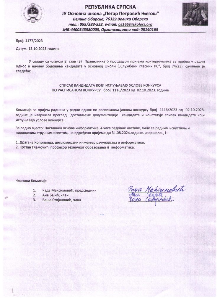 СПИСАК КАНДИДАТА КОЈИ ИСПУЊАВАЈУ УСЛОВЕ КОНКУРСА од 02.10.2023. године